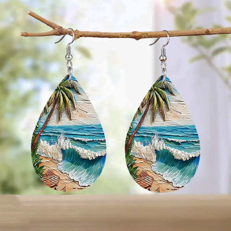 Tropical Beach Scene Faux Leather Earrings